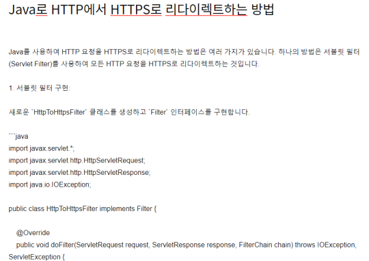 참고로, Java 코드 내에서 리다이렉트를 수행하는 것이 아니라 웹 서버(예: Apache, Nginx) 또는 애플리케이션 서버(예: Tomcat)의 설정을 사용하여 HTTP 요청을 HTTPS로 리다이렉트하는 것이 일반적입니다. 이 방법은 일반적으로 성능상의 이점이 있으며, 리다이렉트 로직을 Java 코드에서 분리할 수 있습니다.