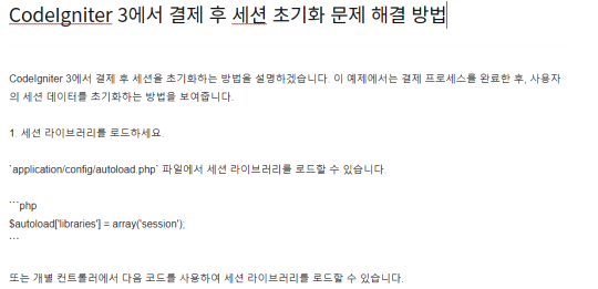 CodeIgniter 3에서 결제 후 세션을 초기화하는 방법을 설명하겠습니다. 이 예제에서는 결제 프로세스를 완료한 후, 사용자의 세션 데이터를 초기화하는 방법을 보여줍니다.