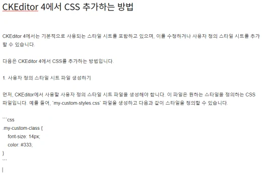 이제 사용자 정의 스타일 시트를 추가했으므로, CKEditor에서 해당 스타일을 적용할 클래스를 정의할 수 있습니다. 예를 들어, 다음과 같이 CKEditor의 본문에 `my-custom-class` 클래스를 적용할 수 있습니다.