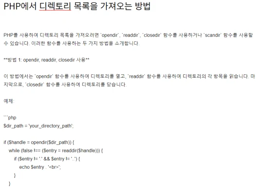 PHP를 사용하여 디렉토리 목록을 가져오려면 `opendir`, `readdir`, `closedir` 함수를 사용하거나 `scandir` 함수를 사용할 수 있습니다. 이러한 함수를 사용하는 두 가지 방법을 소개합니다.