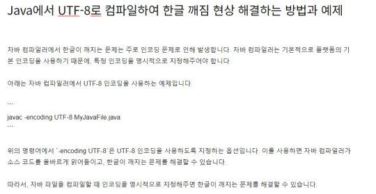 따라서, 자바 파일을 컴파일할 때 인코딩을 명시적으로 지정해주면 한글이 깨지는 문제를 해결할 수 있습니다.