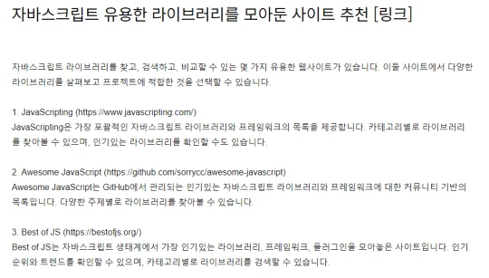 이러한 사이트를 방문하여 다양한 자바스크립트 라이브러리와 프레임워크를 살펴보고 프로젝트에 가장 적합한 라이브러리를 선택하세요.