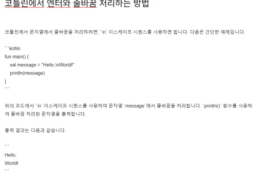 코틀린에서 문자열에서 줄바꿈을 처리하려면, `\n` 이스케이프 시퀀스를 사용하면 됩니다. 다음은 간단한 예제입니다.