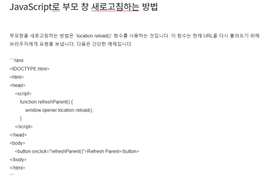 따라서, 자바스크립트를 사용하여 부모 창을 새로고침하는 것은 간단합니다. `window.opener.location.reload()` 코드를 사용하여 부모 창을 새로고침할 수 있습니다. 이를 활용하여 다양한 작업을 수행할 수 있습니다.